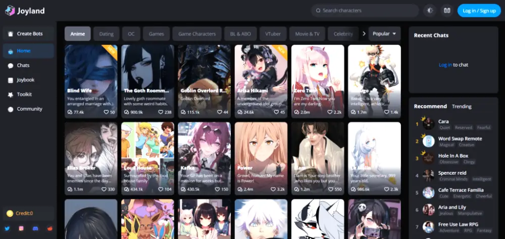 Joyland features a vibrant community gallery where users can share their created bots. You can browse trending characters, “remix” existing ones, or see how other roleplayers are structuring their prompts.